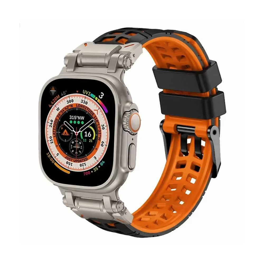 ステンレス製のコネクトパーツと柔軟なシリコンバンドを組み合わせた、タフで快適なApple Watchバンド。