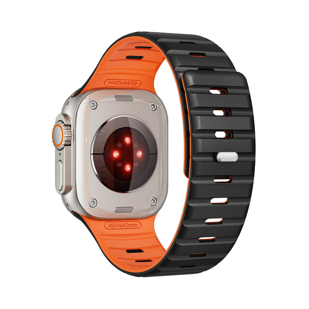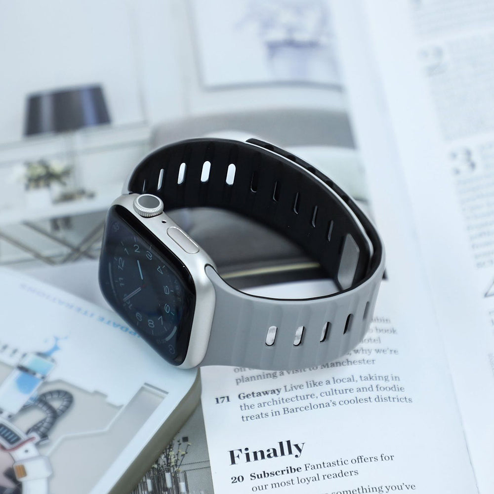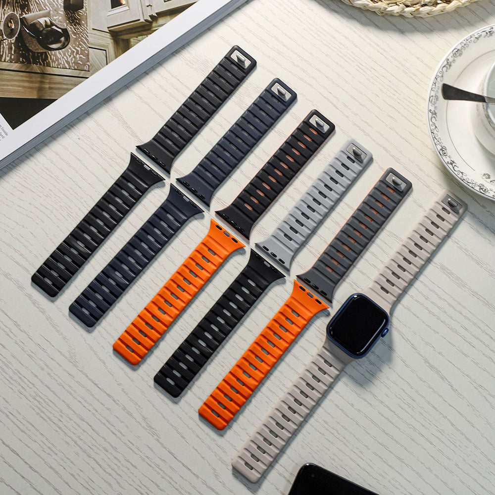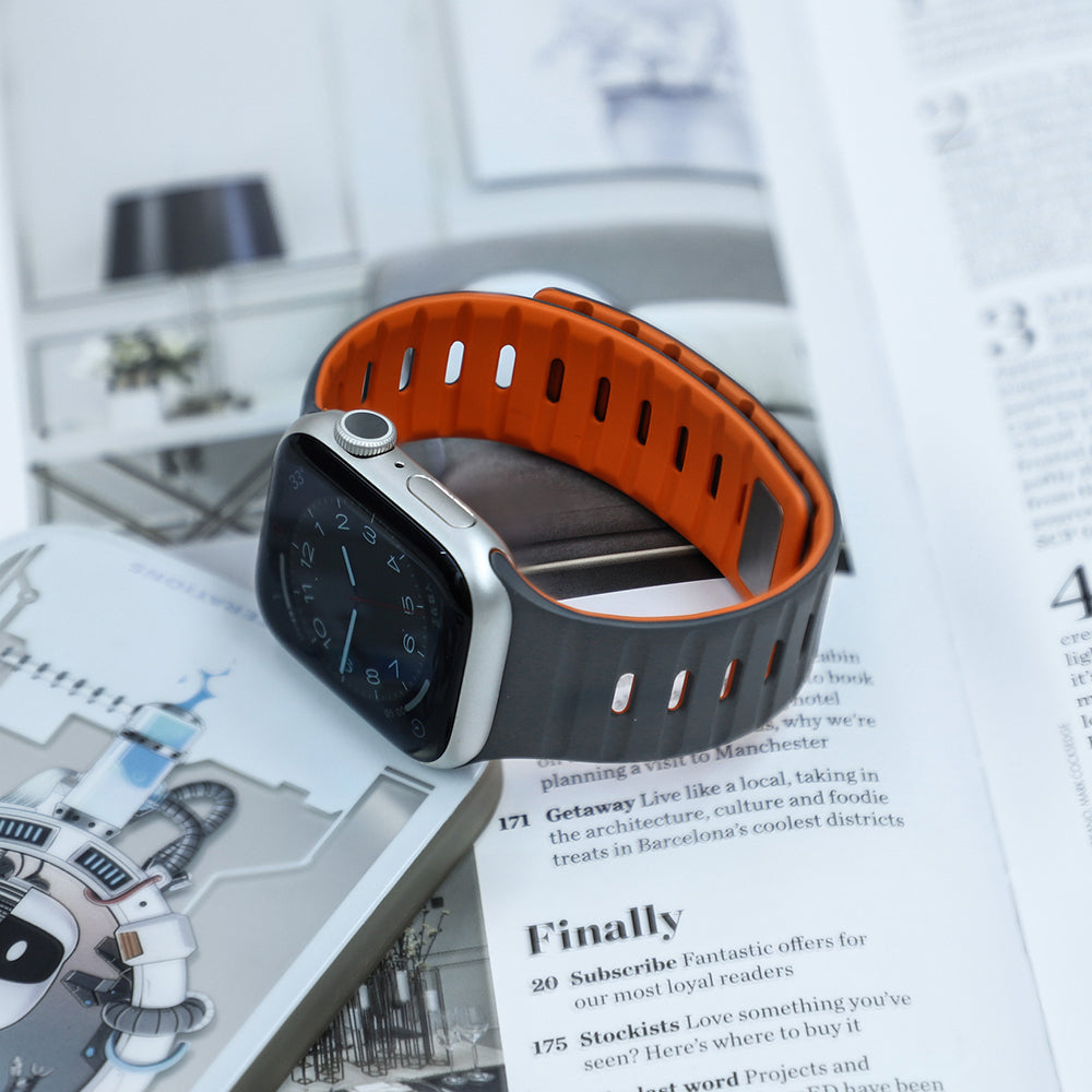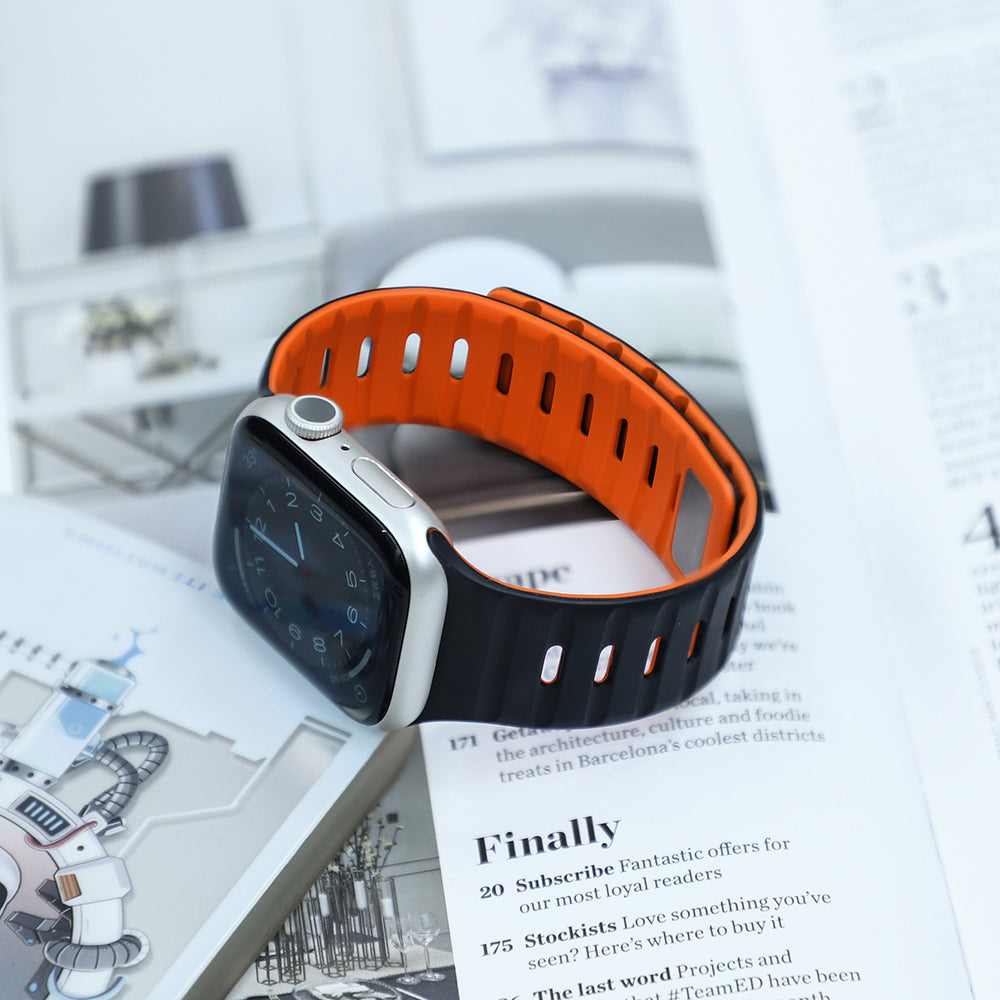 滑らかなシリコン素材に、内側と外側で異なるカラーを組み合わせたバイカラーデザインが特徴のApple Watchバンド。