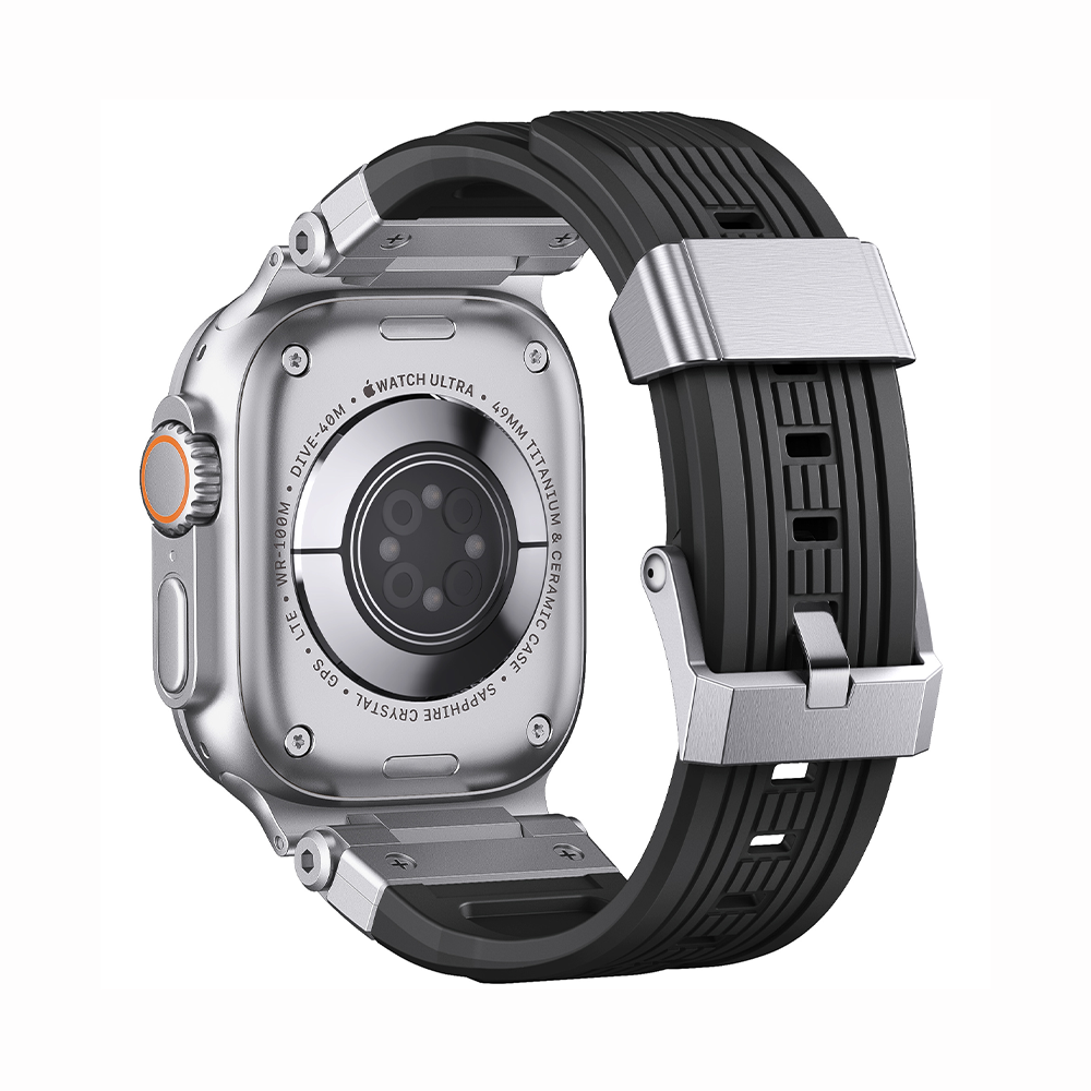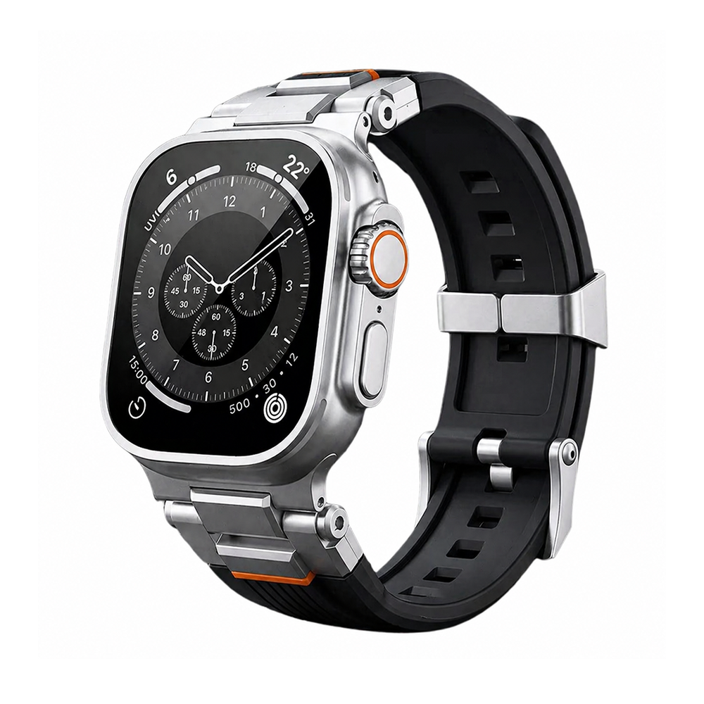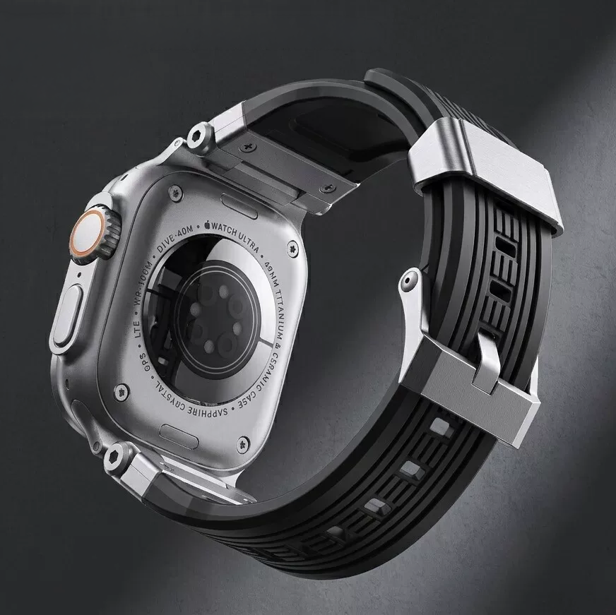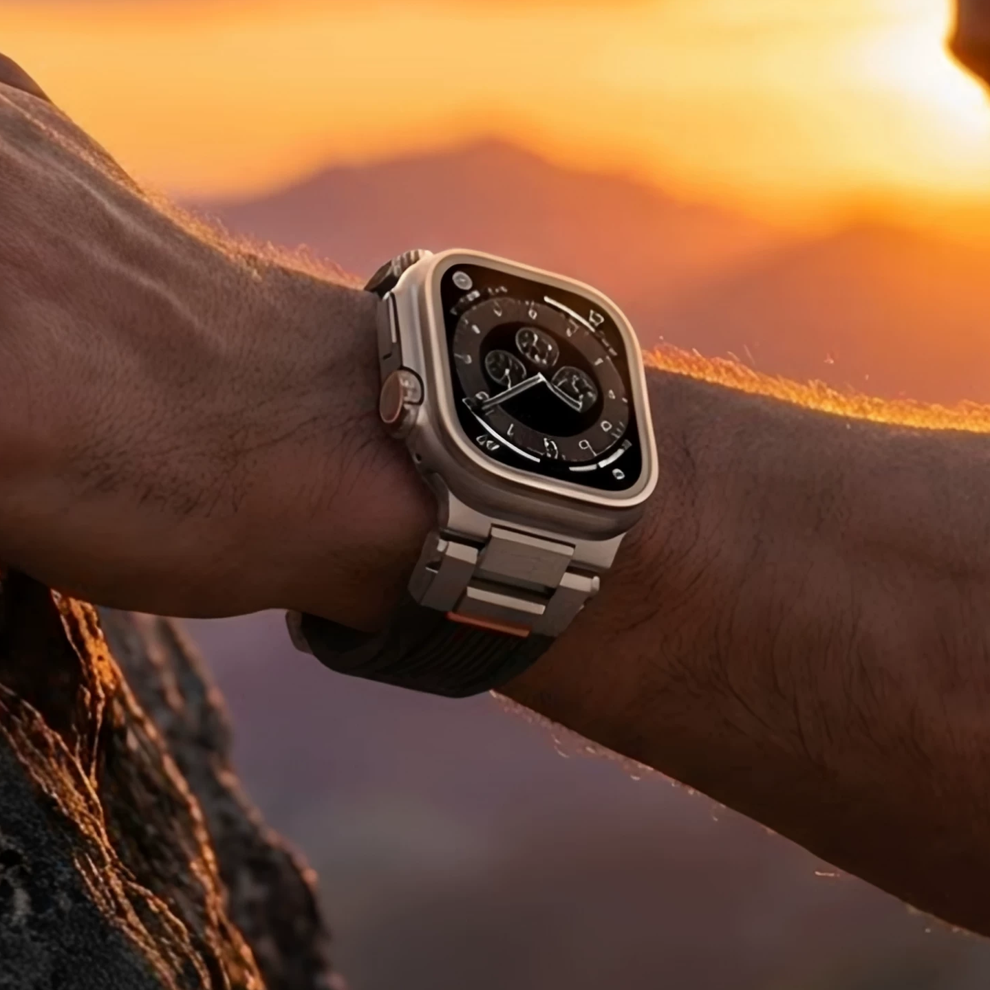無骨でメカニカルなデザインが手元に強いインパクトを与え、Apple Watch Ultra系の力強いフォルムとも相性よく決まります。