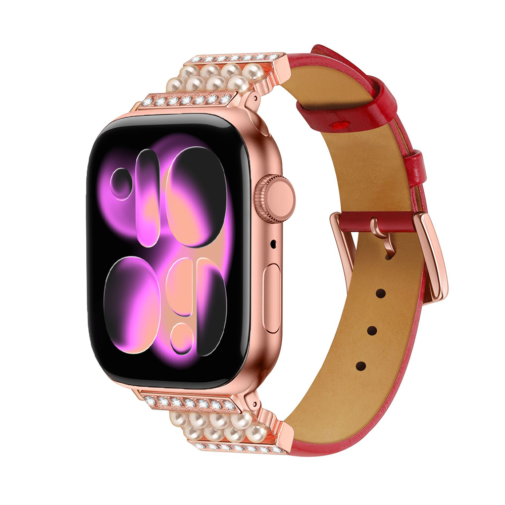レザーにパールとラインストーンを贅沢にあしらった、女性の手元を華やかに彩るApple Watchバンド。