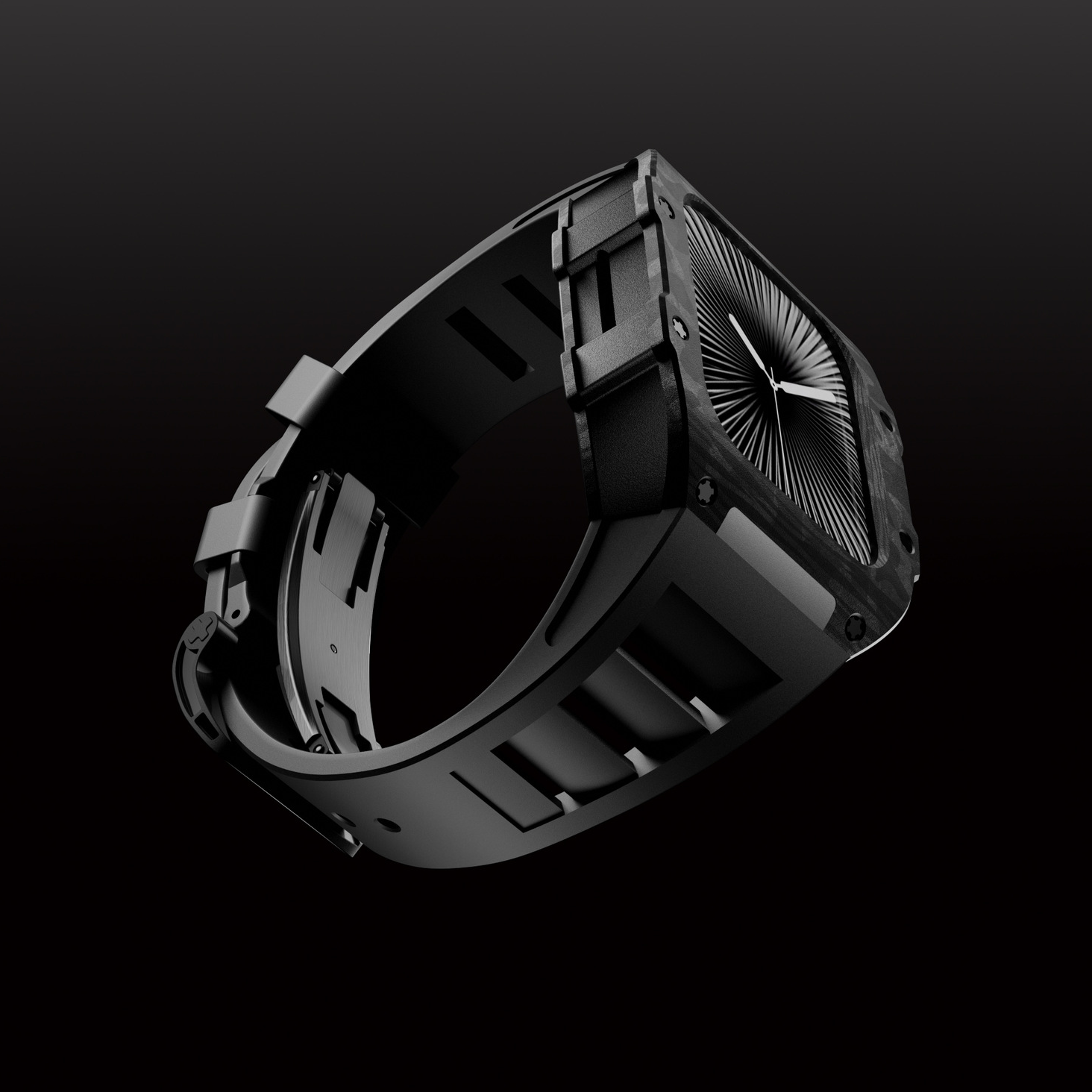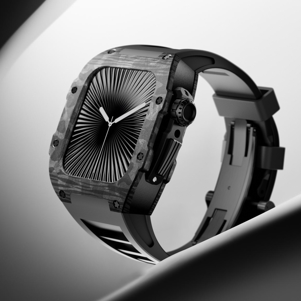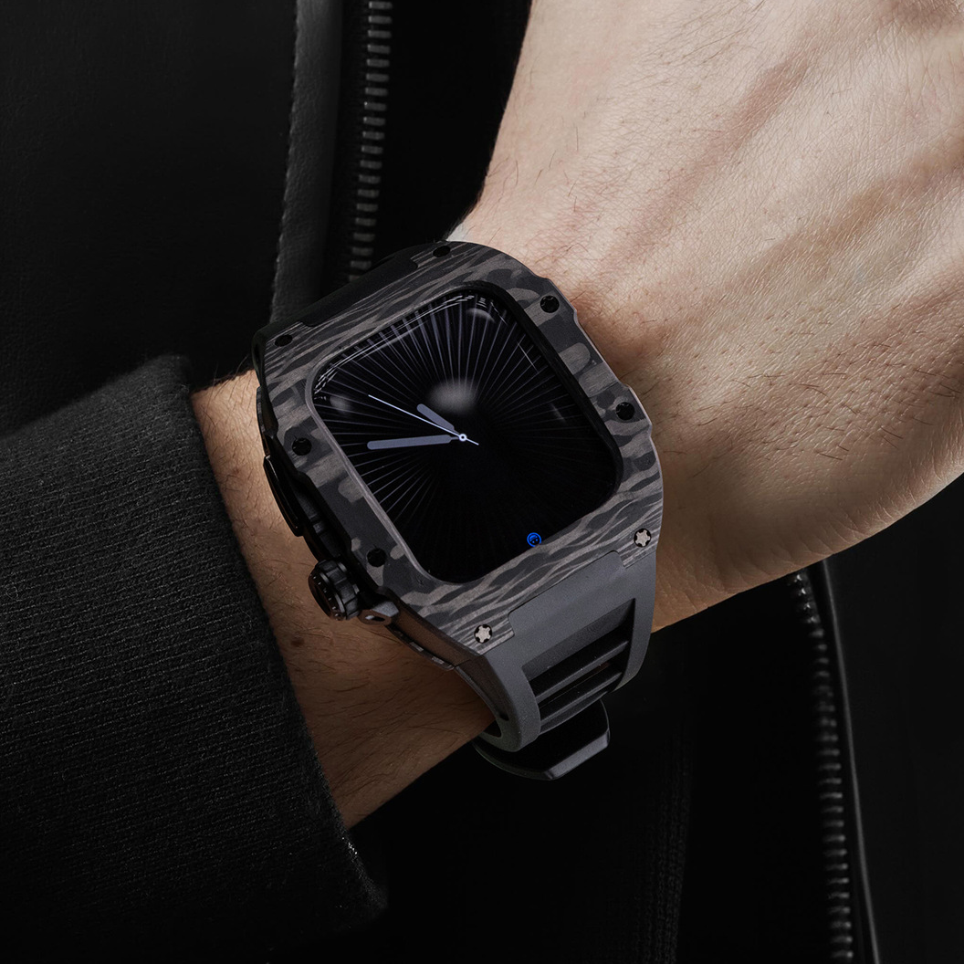 カーボンとステンレスを組み合わせた堅牢なケースと、フィット感に優れたシリコンバンドを融合させたケース一体型のApple Watchバンドです。