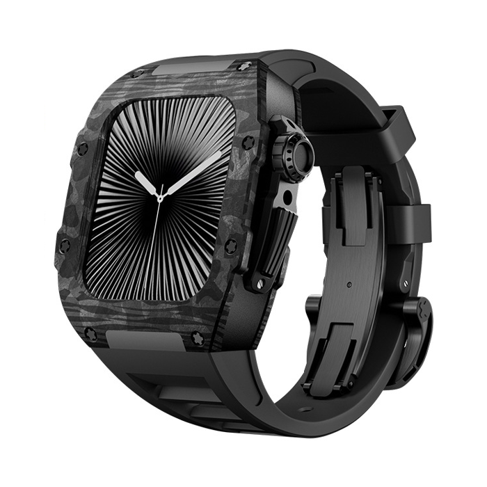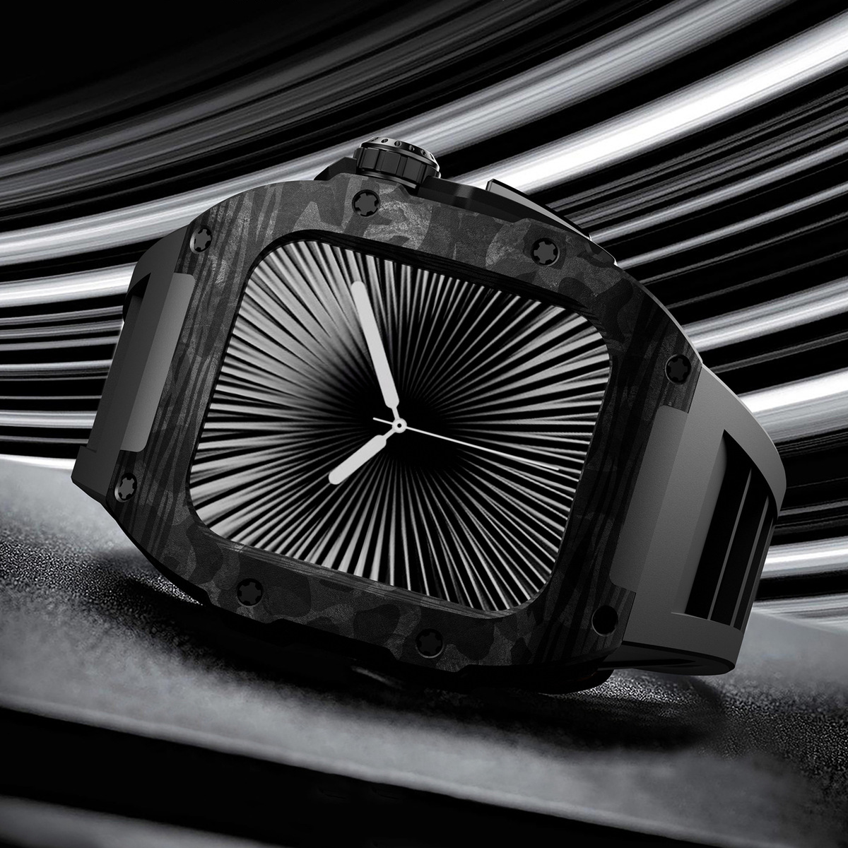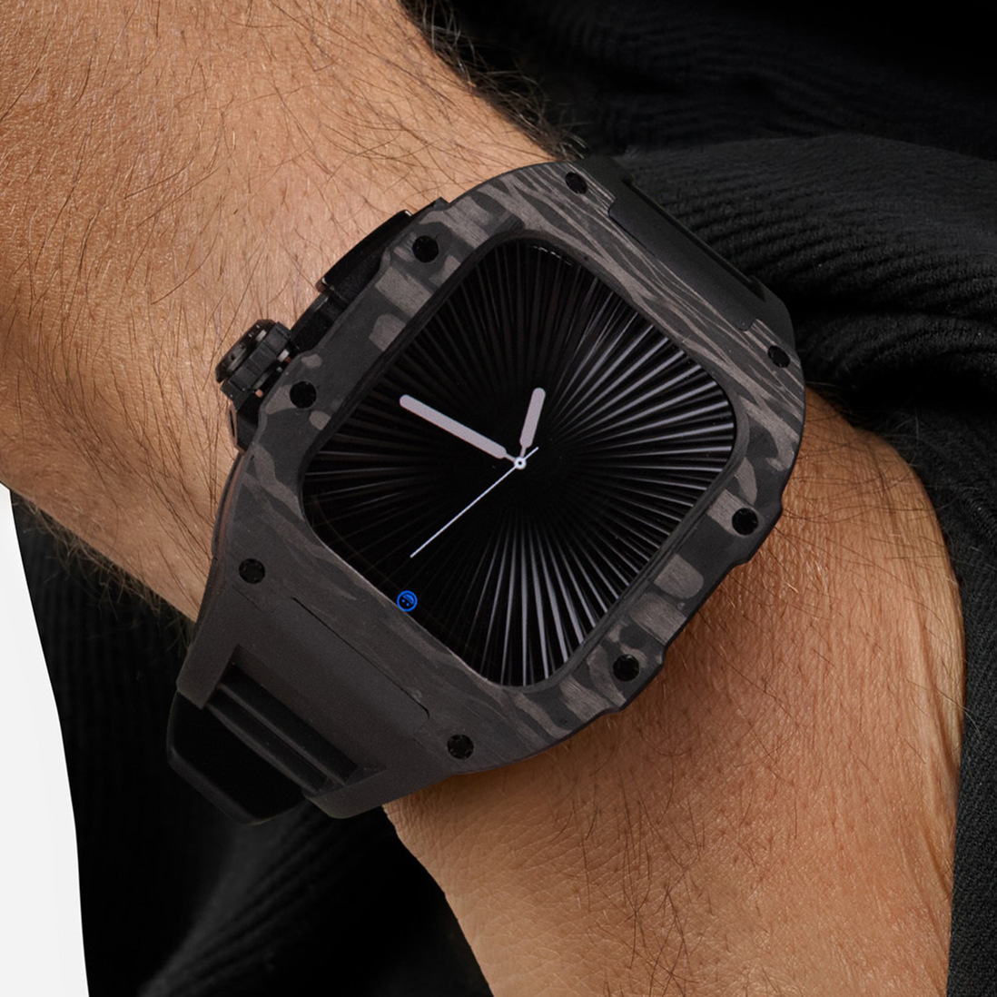 カーボンとステンレスを組み合わせた堅牢なケースと、フィット感に優れたシリコンバンドを融合させたケース一体型のApple Watchバンドです。