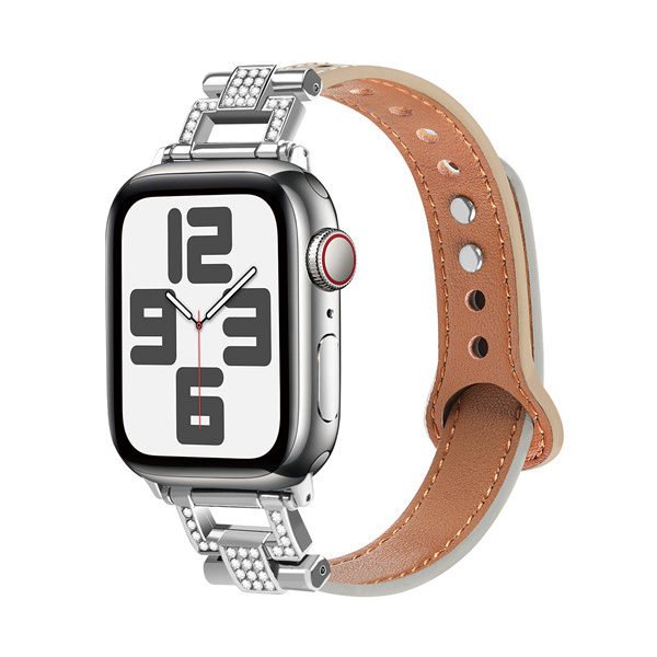 スリムなレザーデザインに、メタルコネクタ部分のラインストーンが華やかさを添えるApple Watchバンドです。
