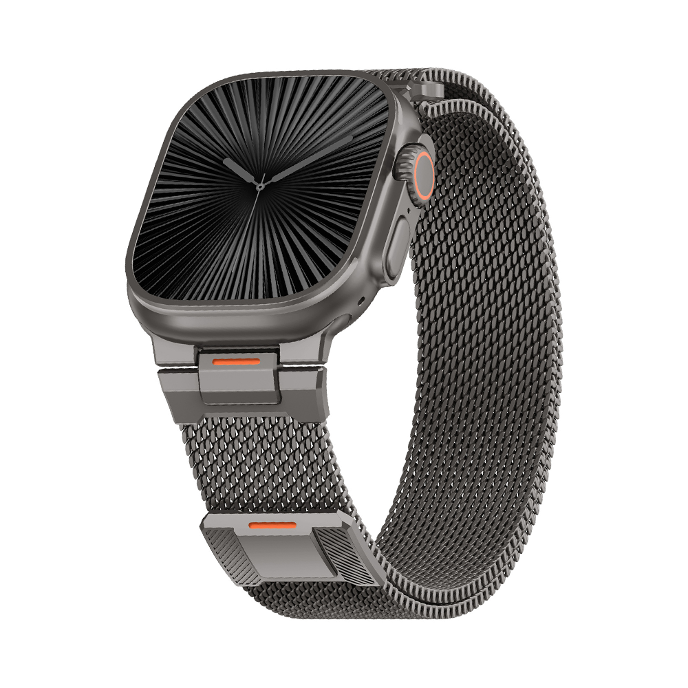 細やかに編み込まれたミラネーゼメッシュに、スタイリッシュなメタルコネクトと留め具を組み合わせたApple Watchバンド。