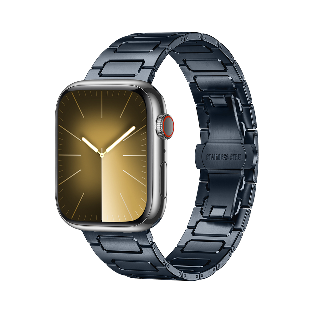 精巧に組み上げられたスクエア型のリンクが、手元に知性と重厚感を与えるステンレス製Apple Watchバンド。