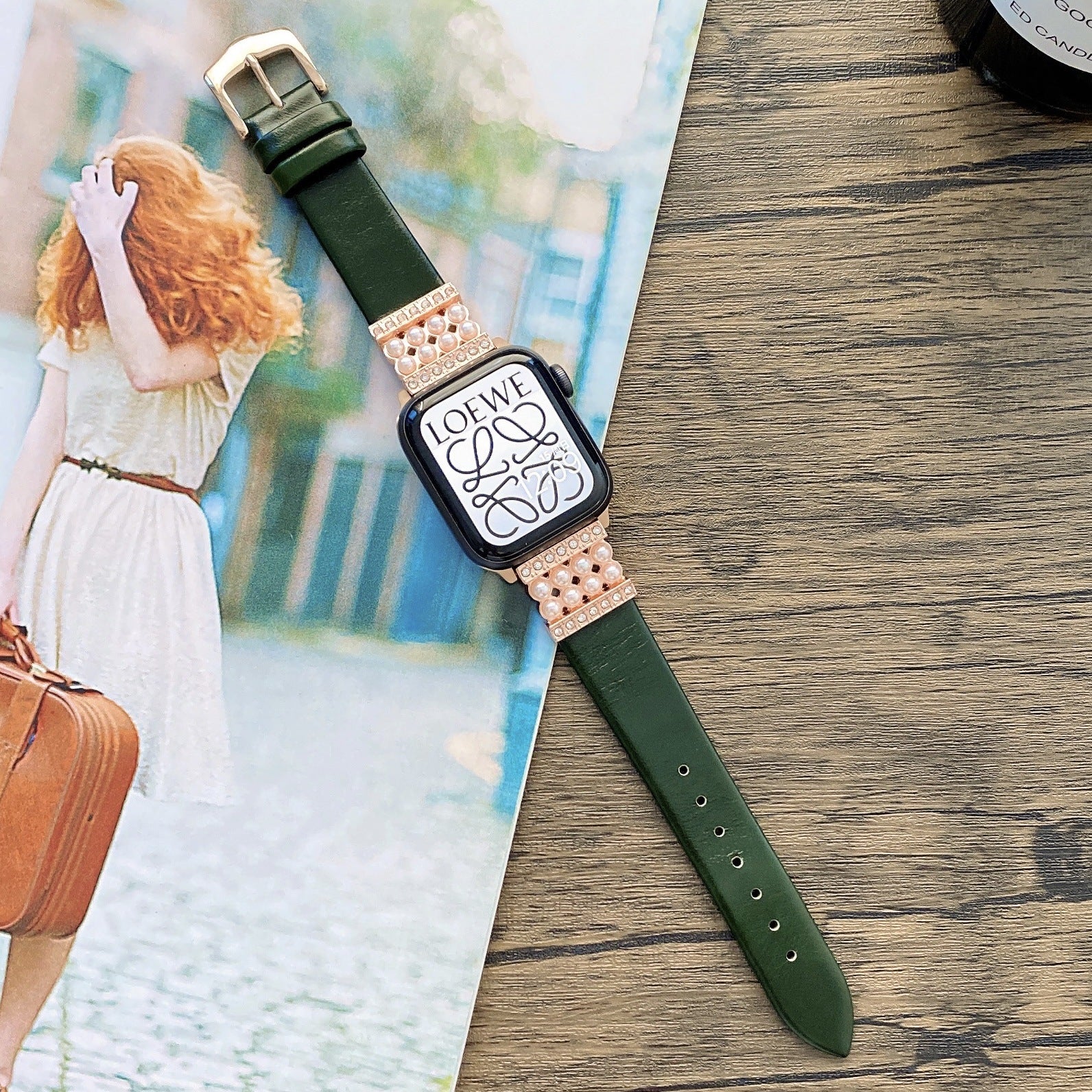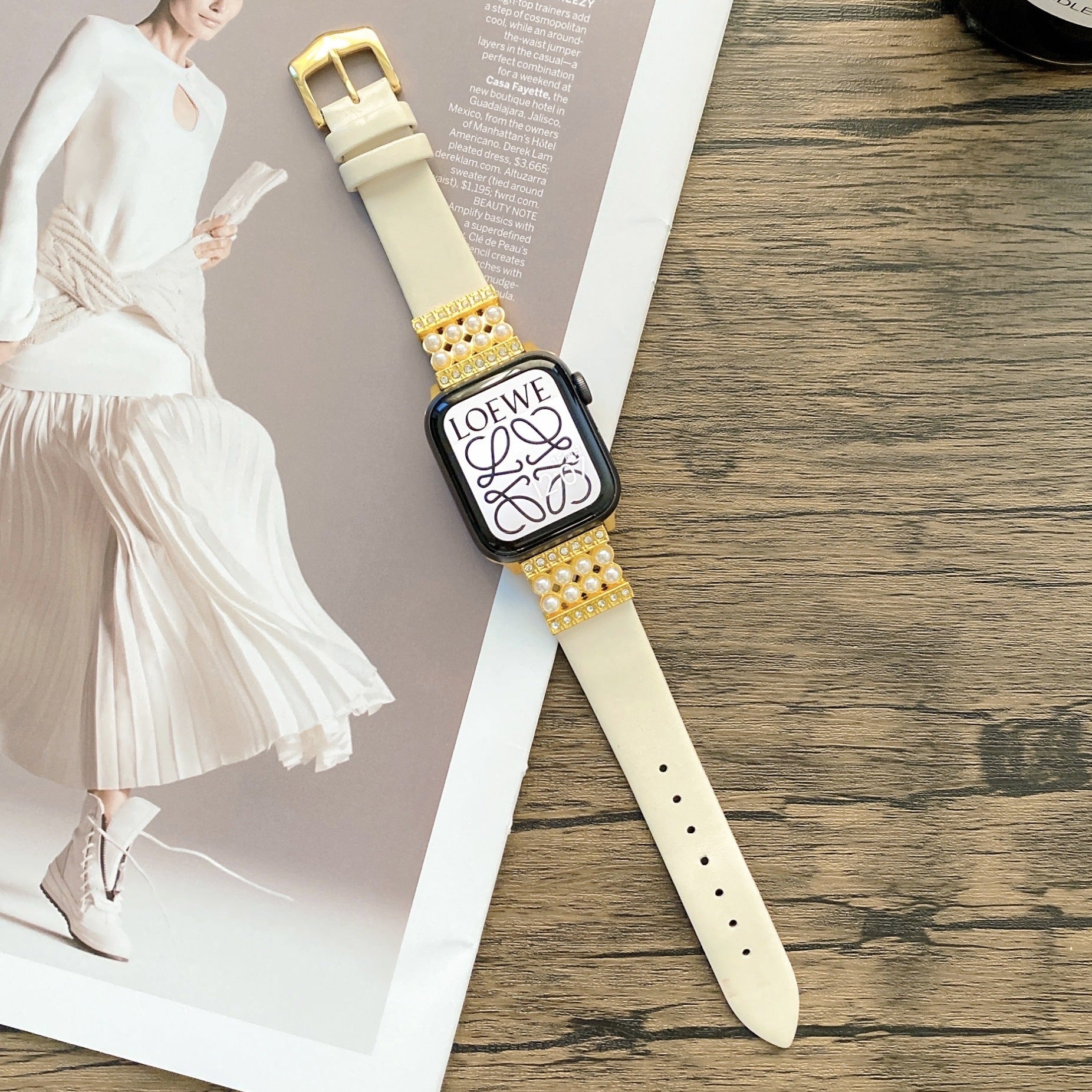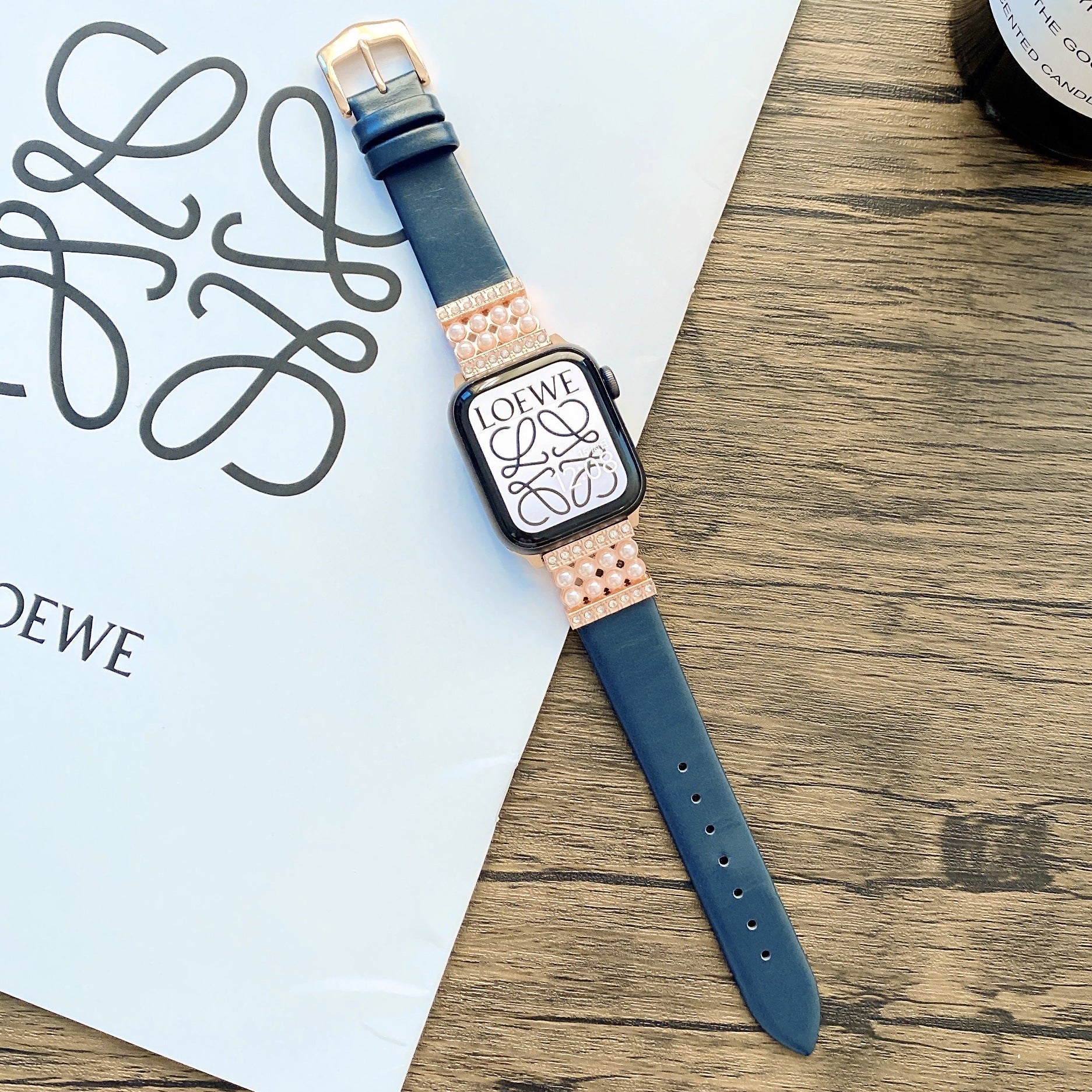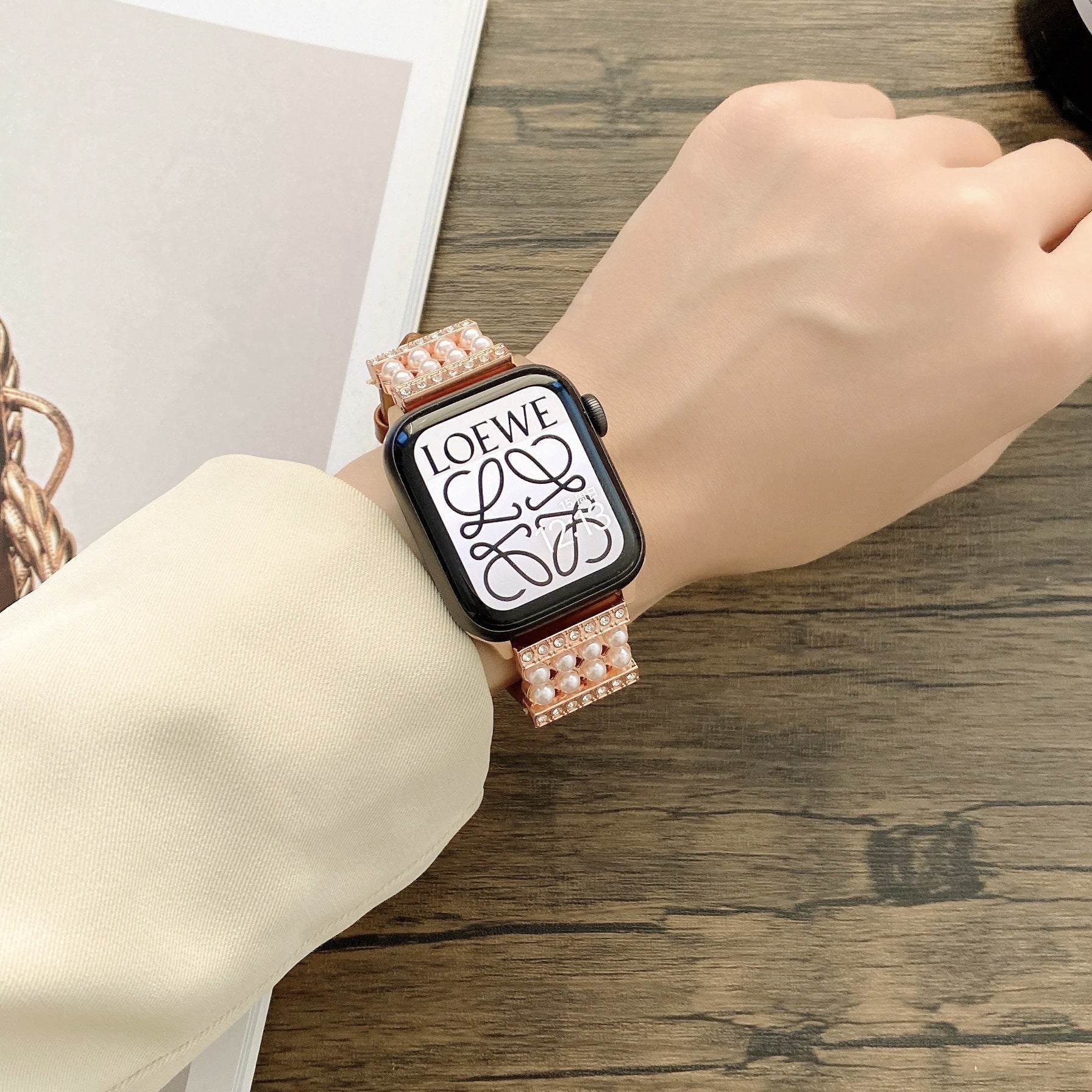 レザーにパールとラインストーンを贅沢にあしらった、女性の手元を華やかに彩るApple Watchバンド。