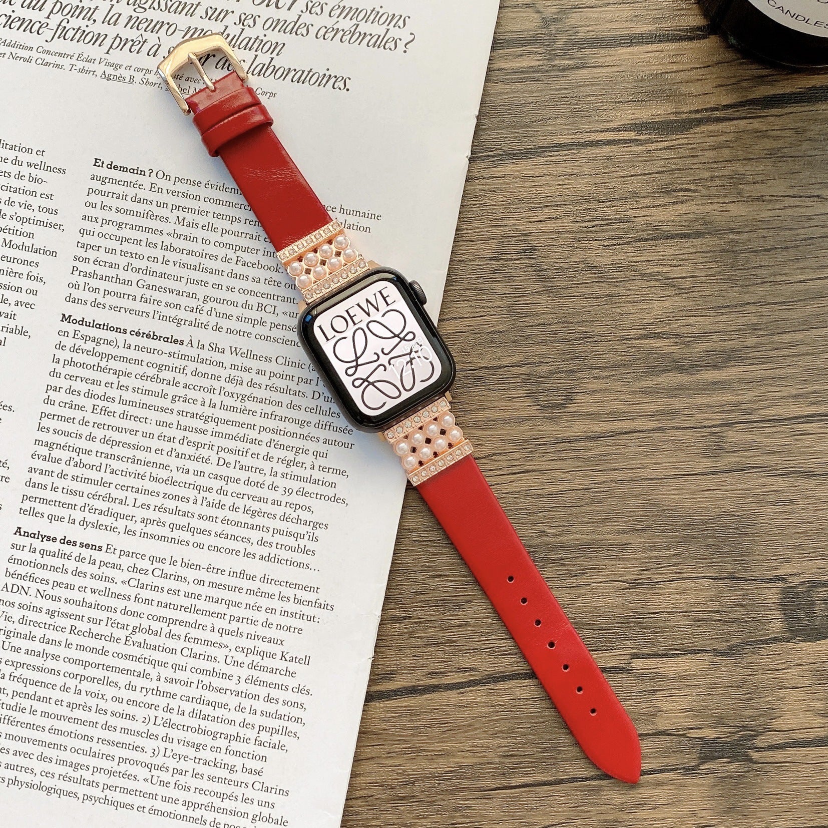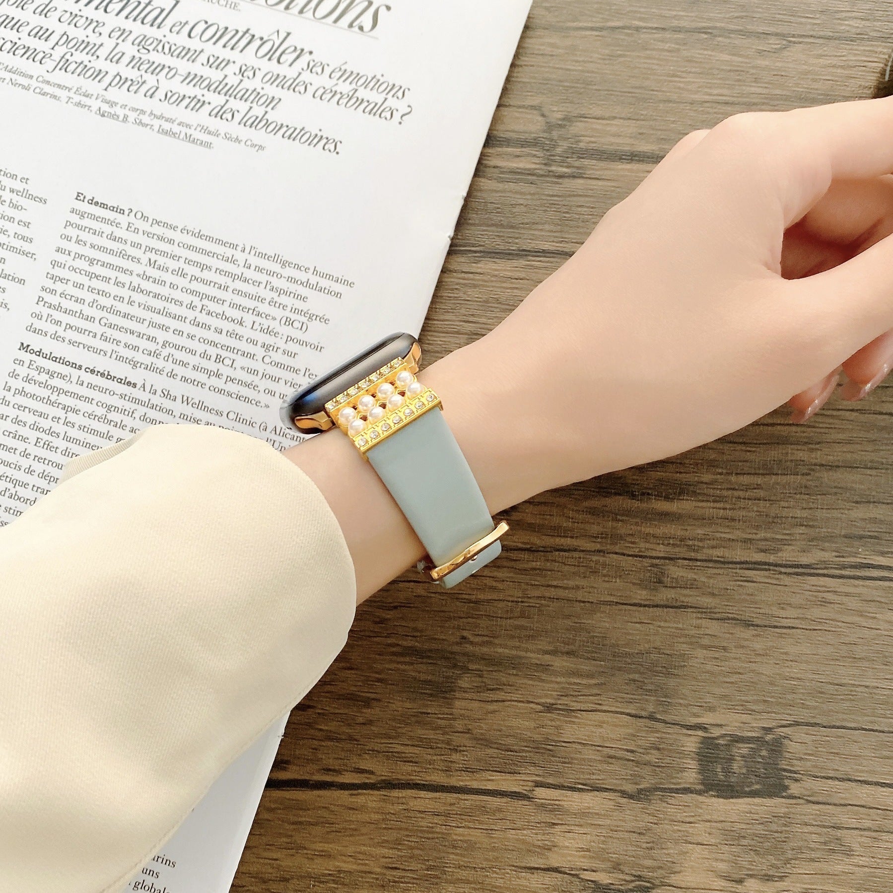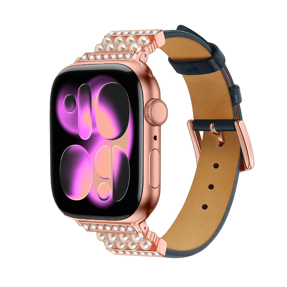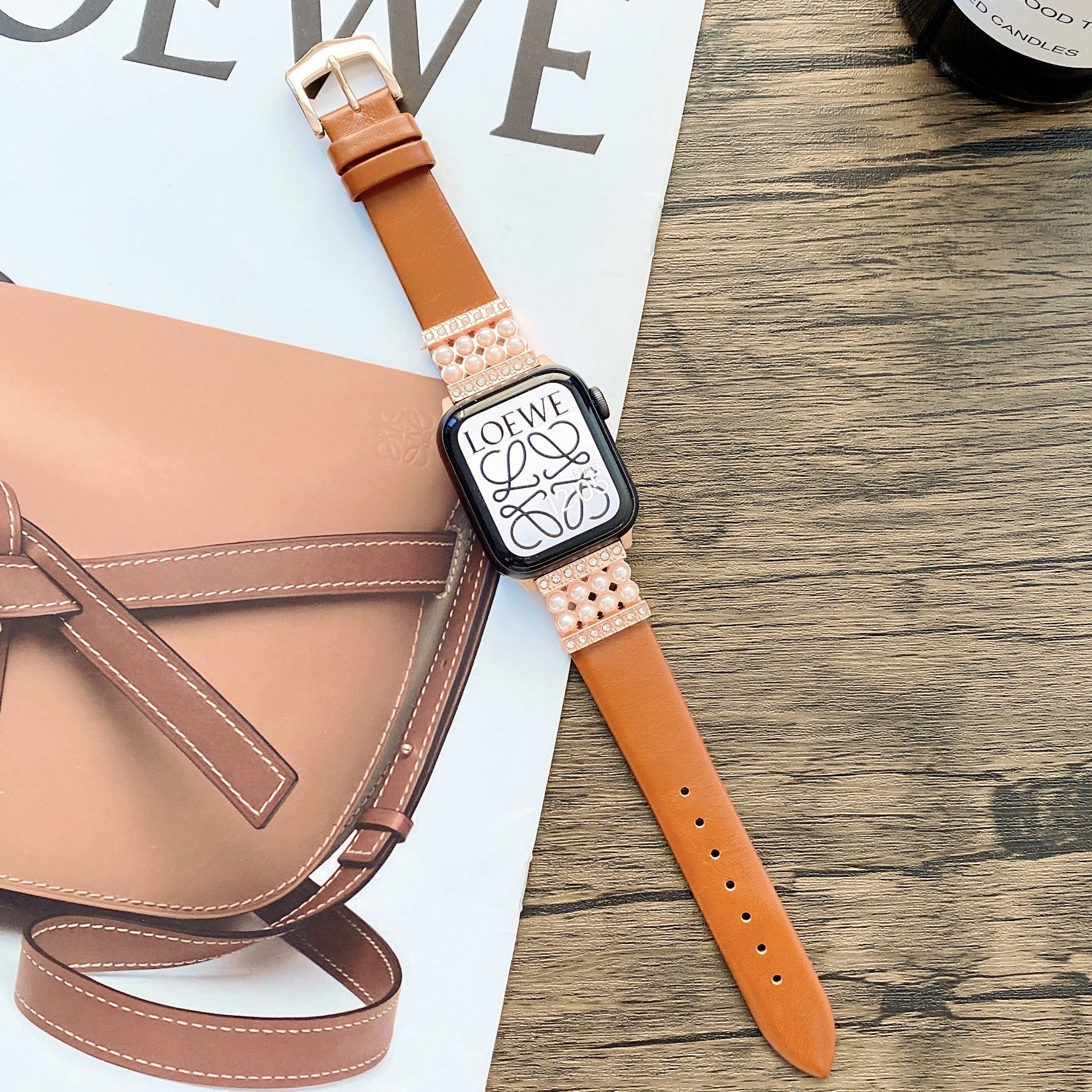 レザーにパールとラインストーンを贅沢にあしらった、女性の手元を華やかに彩るApple Watchバンド。